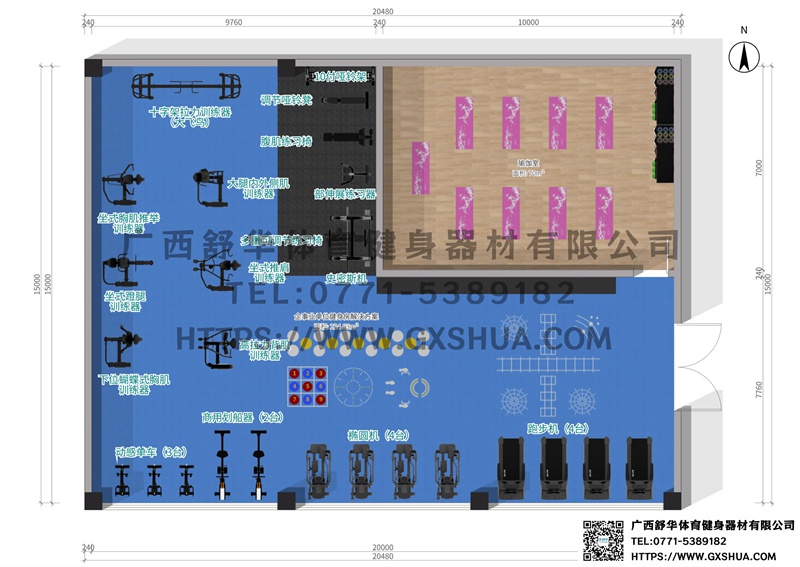 此方案要求面积小于295m²,适用于企事业单位、酒店会所、楼盘社区、工作室、学校等健身场所,能满30-50人同时健身使用。(方案根据场地空间大小、预算、产品需求等进行配置仅为启发性参考)