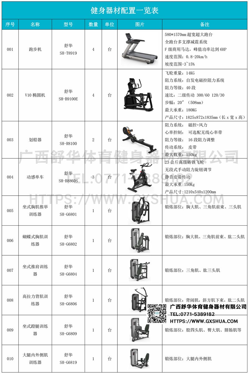 1.好博V9跑步机SH-T8919*4台-580*1570mm超宽超大跑台-跑感舒适,跑台整体安全稳定;全跑台多支撑减震平台,保证跑台超强支撑力,达到180kg支撑,满足专业健身房需求。F级商用马达-超强马达,AC 3.0HP 交流,峰值功率达到6HP,F级商用品质。速度范围达到0.8-20km/h;V9跑步机可实现跑台扬升功能,坡度范围-3~15%,满足客户不同的锻炼需求。