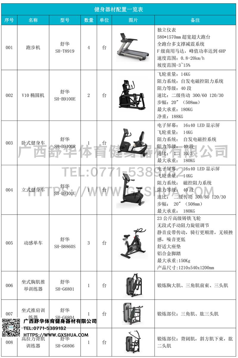 1.好博V9跑步机SH-T8919*4台-独立仪表-简洁大气,全新外观设计,健康运动新选择;心率监测功能,可通过手握心率、无线心率带等不同方式实时采集心率数据;580*1570mm超宽超大跑台-跑感舒适,跑台整体安全稳定;全跑台多支撑减震平台,保证跑台超强支撑力,达到180kg支撑,满足专业健身房需求。F级商用马达-超强马达,AC 3.0HP 交流,峰值功率达到6HP,F级商用品质。速度范围达到0.8-20km/h;V9跑步机可实现跑台扬升功能,坡度范围-3~15%,满足客户不同的锻炼需求。