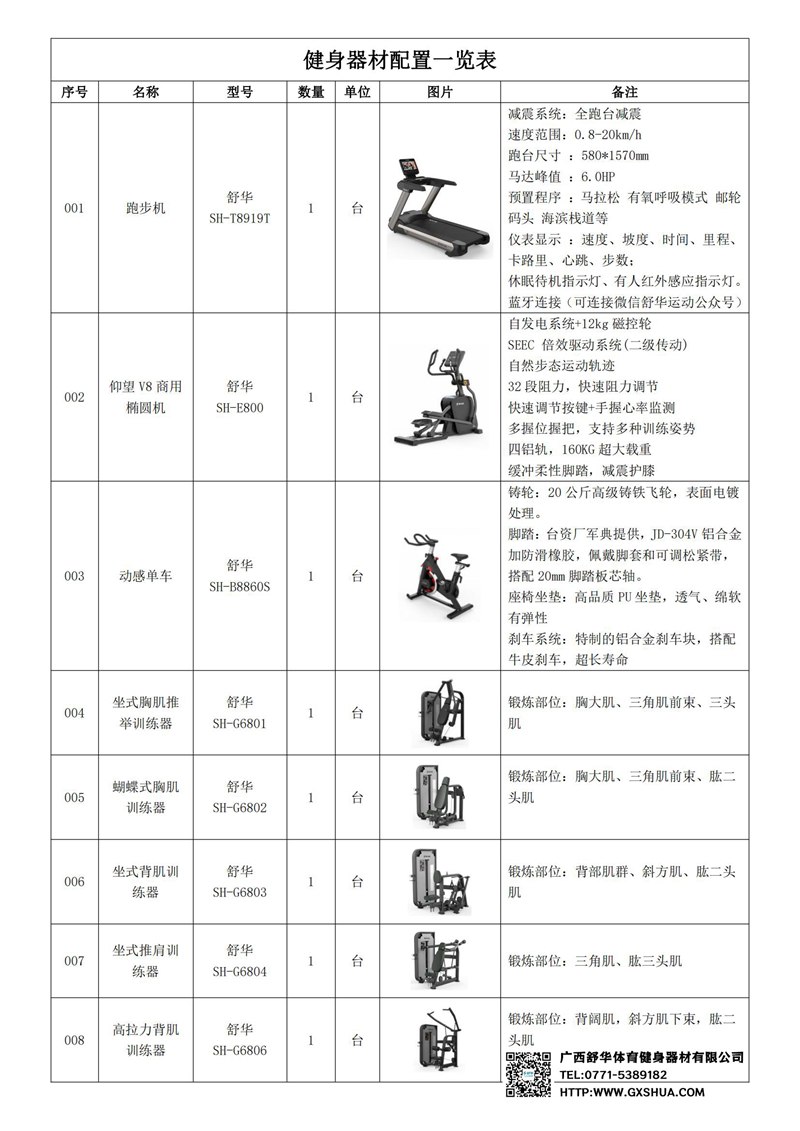 1.好博V9+智能跑步机SH-T8919T*5台-V9+采用全跑台减震设计,为跑者提供舒适的落脚地感和稳定的跑步支撑,良好的缓冲防护,降低膝关节受伤风险。商用大跑台,为跑者提供从容奔跑空间,180kg承载力,580*1570纯跑台面积,满足专业健身需求。V9+采用F级商用马达,6HP峰值马力,20km/h最高速度,提供源源不断的动力。V9+内置健身直播软件,每周提供直播课程,内含大量专业线上健身点播课程,可为健身房不同人群提供多样化健身课程服务。V9+搭载全新跑步姿态分析系统,提供五大步态数据,为跑者提供综合评估及训练建议,帮助跑者调整优化跑姿,让运动更科学高效。3D竞赛软件,画面如同VR游戏效果,提供训练及竞赛模式,线上竞赛模式,可联动不同单位及公司,不同健身房之间健身爱好者,打造职工健身文化,促进交流。