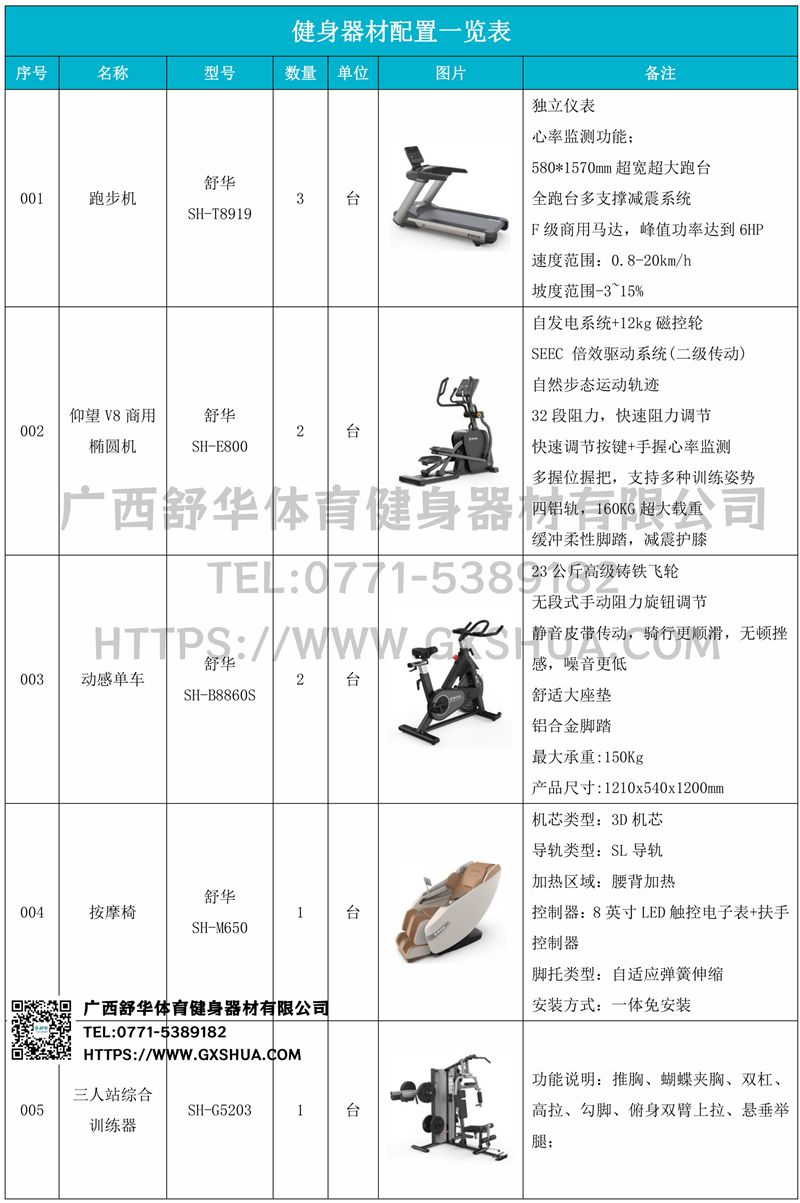 1.好博V9跑步机SH-T8919*3台-F级商用马达-超强马达,AC 3.0HP 交流,峰值功率达到6HP,F级商用品质。速度范围达到0.8-20km/h;V9跑步机可实现跑台扬升功能,坡度范围-3~15%,满足客户不同的锻炼需求。